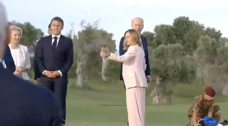 Then, with his back to the international leaders, Meloni approached Biden in reverse and gently stroked the president’s right arm to signal that he was welcome to re-join the group.